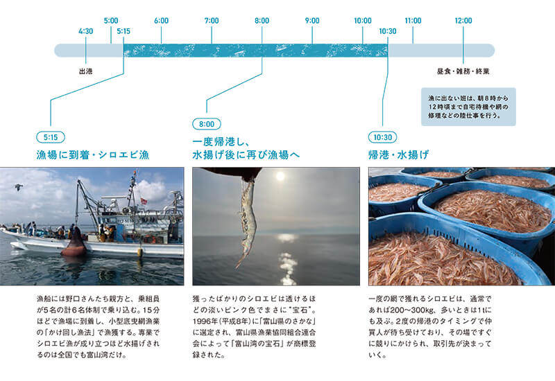 4月1日から11月30日までがシロエビの漁期。漁に出る班は早朝から出勤・出港し、一度帰港してから再び出港する、基本的に1日2回の漁。一方で休漁する班は、自宅や組合事務所で待機する、陸仕事するなどして過ごす。競りの時間になると休漁班の親方も顔を出す。午後になると終業。