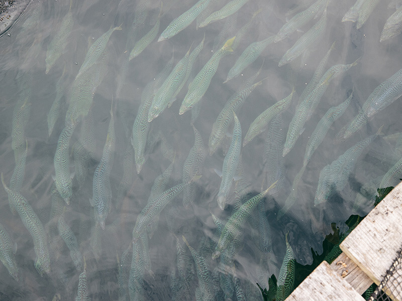 丸徳水産の生け簀で泳ぐサバ。海にも漁業関係者にも優しい循環型漁業を掲げる