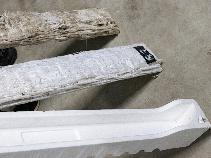 海を漂った発泡スチロール(奥)と家庭ゴミでは色も耐久性も異なる