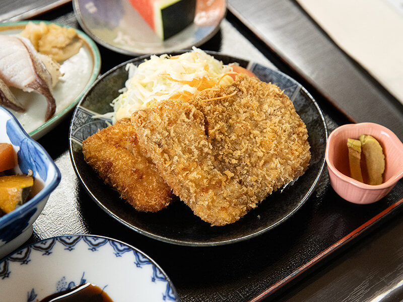 初日の夕飯は、丸徳水産が経営する「肴や えん」でいただく。イスズミのメンチカツとアイゴのフライは、臭みを感じることなく、白身魚の料理として味わった。