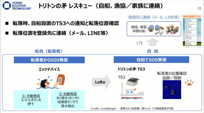 さらに今回はオプション機能の救援支援システム『トリトンの矛レスキュー』も紹介された。ライフジャケットにエッジデバイスを装着することで、漁船に搭載したIoT機器と連携。漁業者が転落時にエッジデバイスを押すことでSOSが発信され、仲間の船や漁協、家族等のメールやLINEに自動発信される仕組みだ。