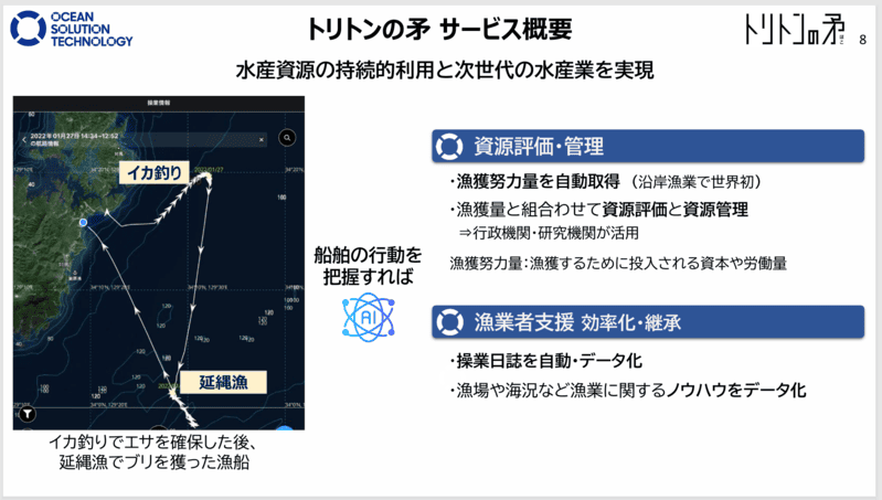 オーシャンソリューションテクノロジー株式会社(長崎県佐世保市)が開発した「トリトンの矛」は、漁師の経験と勘をデータ化し、次世代へ継承するための水産DXツール。漁船の航跡データや海水温・潮流など日々の海況情報を自動で取得し、AIが操業日誌を自動生成してくれる。