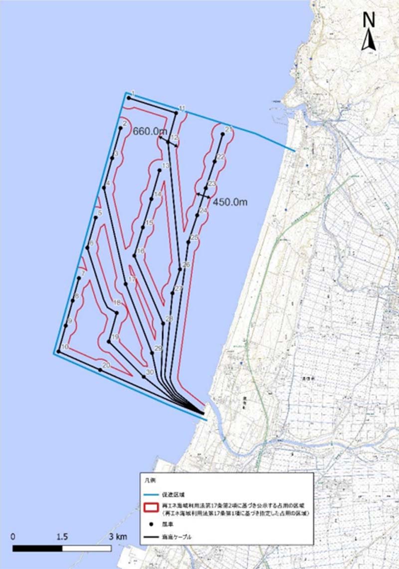 会議では、事業者側が30基の風車設置のレイアウトを公表した。これまでの法定協議会の話し合いで、地域における漁業の状況等に鑑み、海岸線から1海里(1マイル)より陸側の海域には海底ケーブル及びその附属設備を除く洋上風力発電設備など(ブレード回転エリアを含む)を設置しないこと
