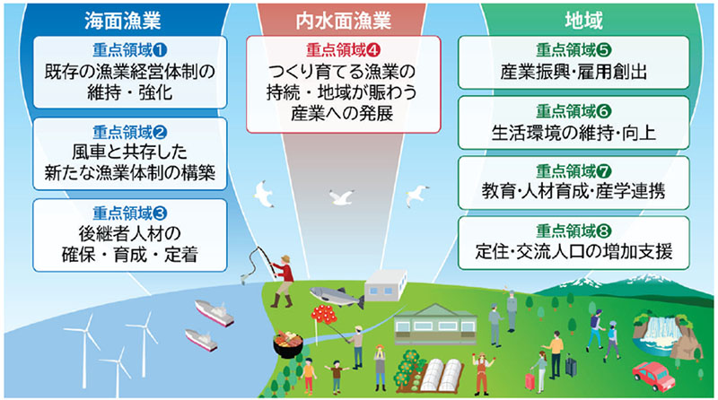 地域振興策としては、8つの重点領域を掲げている。そのうち、4つの重点領域は漁業関連の取り組みだ。